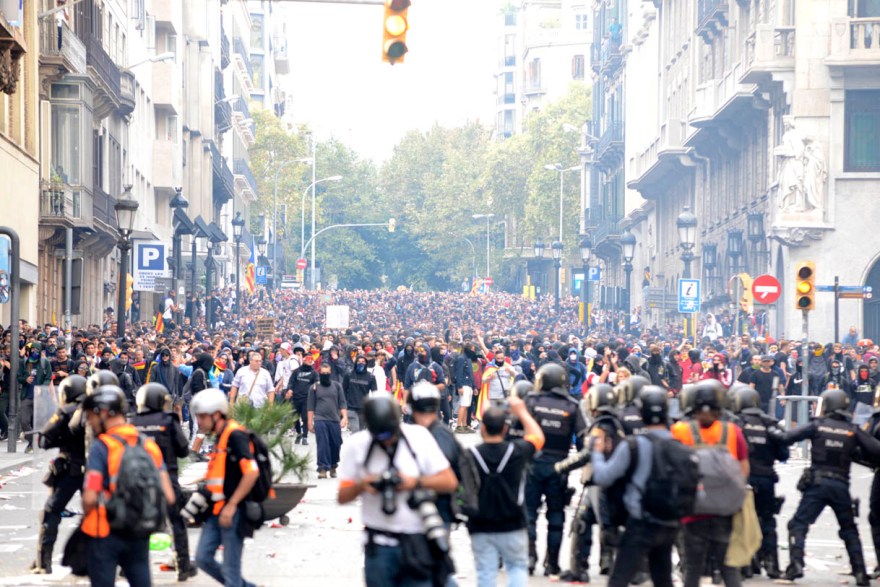 Por la tarde, los niveles suben y empiezan las cargas policiales así como la quema de contenedores, el lanzamiento de piedras, botellas, losetas arrancadas de las aceras, vallas de obra, pelotas de goma… Se requiere del uso de una tanqueta con una manga de agua comprada a Israel en 1994 y que todavía no se había usado nunca para frenar las acometidas y construcción de barricadas de unos 500 chicos y chicas más combativos. Los enfrentamientos acaban de madrugada tras varias horas ofreciendo un aspecto, especialmente en la Plaza Urquinaona, de batalla campal y que hacía muchos años que no se veía en Barcelona. De hecho, los Mossos nunca se habían enfrentado, en palabras del conseller de Interior, a nada parecido hasta la fecha. Será momento, esperemos, para el diálogo y para tratar de encontrar soluciones políticas a problemas políticos.