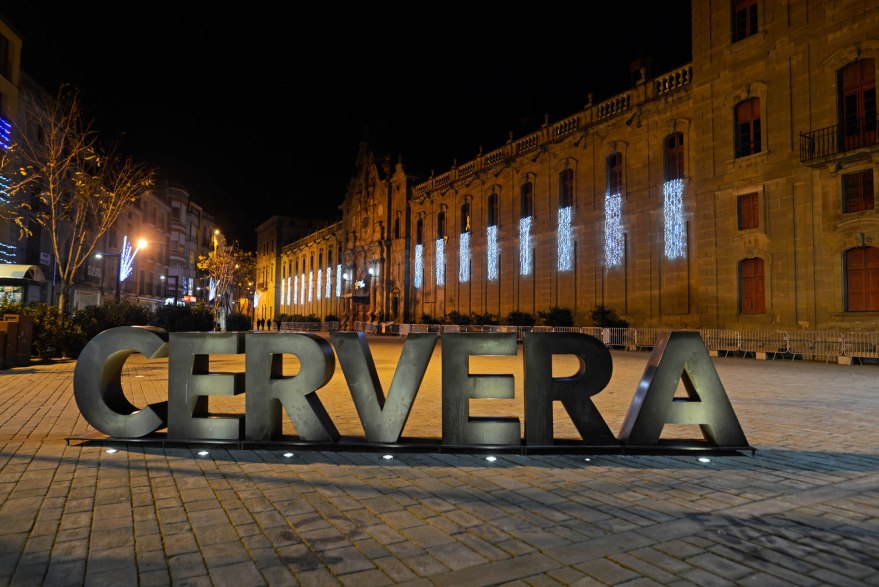 Capital de la comarca de la Segarra, de unos 10.000 habitantes (9.440), Cervera destaca, y así lo señalan desde el propio Ayuntamiento en su web, por su espectacular universidad. El edificio, que data de comienzos del siglo XVIII y que tiene origen monárquico, muestra una fachada de estilo barroco muy trabajada. La portalada, impresionante, consta de dos columnas, a lado y lado, con la figura de la Inmaculada Concepción, patrona de los estudiantes, sobre la misma. Dsifrutamos, durante nuestra visita, de esa maravilla ya anocheciendo y empezando a iluminarse. La estampa, sin duda, es llamativa y reclamo lógico y natural de esta ciudad de tamaño medio, tirando a pequeña, de poderosa y potente muralla exterior.