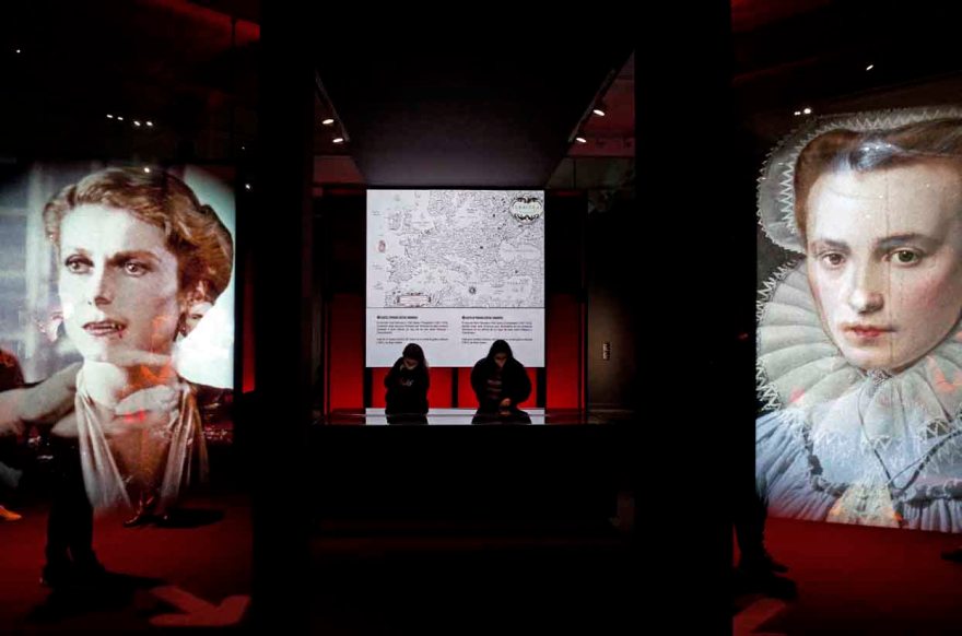 Al llegar, una chica hacía una pequeña introducción de varios minutos (“tres”, precisó aunque probablemente fueron más y de agradecer como interesante antesala de la muestra) de las distintas secciones de que constaba la exposición, presentada en una puesta en escena espectacular y muy llamativa. Aparecían en esa primera sala muchos de los rostros más conocidos que han dado vida en el celuloide a este temido personaje, que se iban desvaneciendo dando pie a otros y recordando la naturaleza extraña del vampiro (recordemos que éste no se refleja en los espejos y que era mortalmente sensible a la luz del Sol). No faltaban imágenes de grandes estrellas de hoy y pasadas, como Tom Cruise o Bela Lugosi (éste, posiblemente, según se cita en la exposición “el drácula más famoso de la historia del cine”) pero tampoco de personajes históricos vinculados a este mito y que, en algunos casos, tenían rasgos de mujer. En la primera sección se hacía un repaso histórico a los muchos lugares en Europa relacionados de una manera u otra con el mito del vampiro y que no solo se localizaban en Europa Central, ya que también se citaban muchos de los escenarios elegidos por los directores para ambientar sus películas y que cubrían un amplio radio de acción, que nos llevaba por ejemplo a castillos de Gran Bretaña o de Bélgica. Los libros, por supuesto, también ocupaban lugar preferente con copias del primer tercio del siglo XIX. No hay que olvidar que el mito del vampiro tuvo mucho segumiento entre los escritores románticos de aquella centúria.