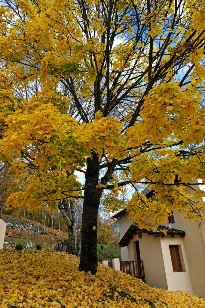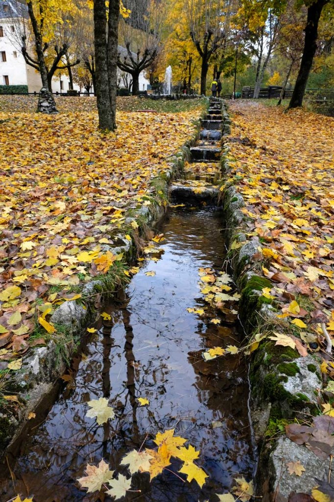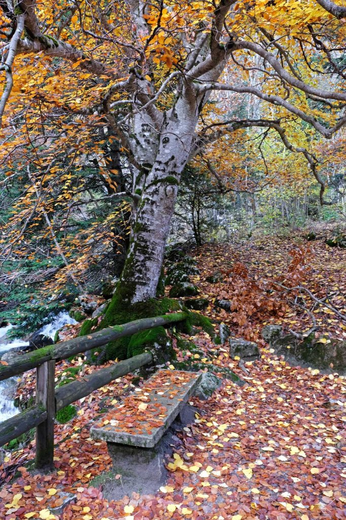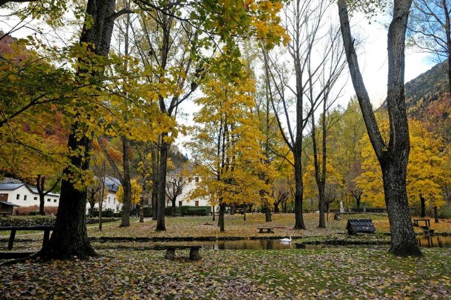 Llegamos por recomendación de un trabajador del complejo urbanístico de Pla de l?Ermita, en la zona de la Vall de Boi, y que nos aconsejó antes de irnos acercarnos hasta Caldes de Boi. Llegamos tras apenas diez minutos de coche, superado el desvió en la carretera hacia el aparcamiento del Parque Nacional d’Aigüestortes -que queda subiendo, a la derecha- y en lo que parecía, por el estado del pavimento, la parte final del recorrido asfaltado. Nos sorprendieron dos cisnes en un estanque, majestuosos, elegantes. También, solitarios y con picores evidentes y algo preocupantes. Alrededor, un manto de hojas ocres, naranjas y rojas tapaba como un tapiz lo que se atisbaba a intuir eran pequeñas pistas de minigolf. Todo el recinto residencial se presentaba en estado latente, igual cerrado. Pese a ello nos dejamos llevar por las indicaciones que nos marcaban destino a varias fuentes de aguas termales – muy buenas para la salud pero calientes y de olor poco favorable, según comprovamos- y a una cascada que se oia, ruidosa, y que pudimos ver de cerca y desde varios puntos. Delante nuestro, una pareja, garrafa en ristre, iba a cargar sus depósitos para aquel día y probablemente para varios más. En el tiempo que estuvimos se pararon varios coches y vimos a una familia y algún que otro grupo, aunque poco más. Ya nos habían dicho que era temporada baja: un momento delicioso patra darse una vuelta por una de las zonas más bonitas de Catalunya, especialmente cuando el otoño ya asoma y la naturaleza inicia su transformación y se prepara para el invierno.