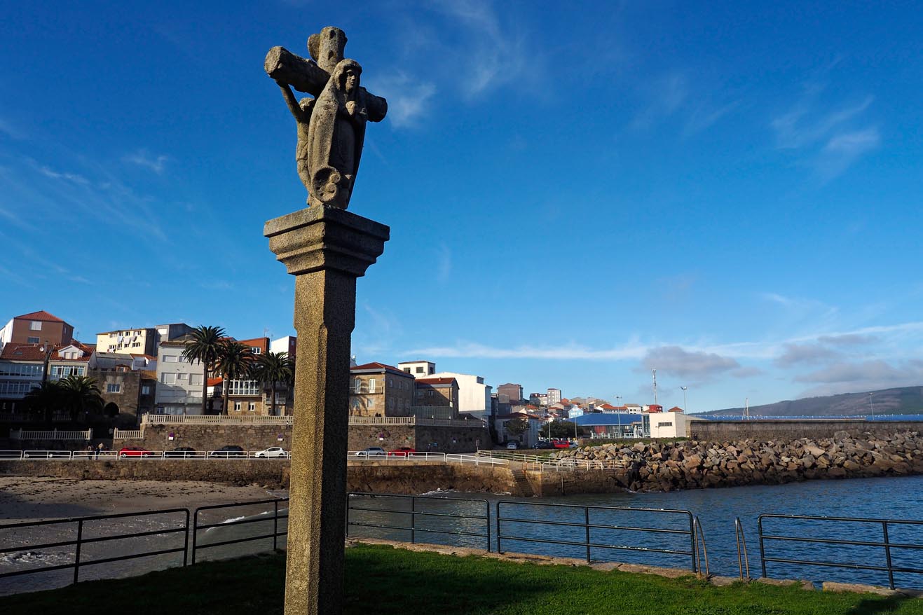 De regreso -la ida y vuelta las hicimos en autobús desde Santiago, de una durada en ambos casos de unas dos horas, a las que añadir los 2,2 kilómetros a pie desde el pueblo de Fisterra (en gallego)-, hicimos una pequeña parada para descubrir al lado de la carretera el nuevo cementerio de esta localidad y que desde Turismo de Galicia destacan. Es obra del arquitecto César Portela y consta de varios cubos regulares de grandes dimensiones. Están en una de las laderas de la montaña y más o menos próximos al mar. También, de vuelta, nos dimos, ya lo habíamos visto a la ida, con una escultura sobre un pedestal y casi a escala natural de reconocimiento a los peregrinos.