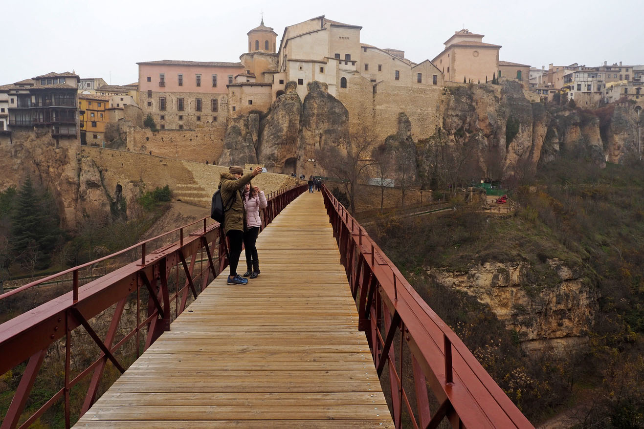 Por supuesto vimos las Casas Colgadas: espacio emblemático de la ciudad, de origen confuso (hay quien las atribuye a los musulmanes y otros que consideran que son medievales, de entre los siglos XIV a XVI), que durante algún tiempo actuaron como casa consistorial y que fueron restauradas durante los años 6o del siglo XX. Cerca se encuentra el puente del siglo XVI, inicialmente de cinco arcos -de los que hoy todavía queda algo conservado- de San Pablo. En su momento, de piedra, unía el Convento de la Orden de Santo Domingo -y del que el puente hereda el nombre- con el pueblo. Deteriorado, en el siglo XIX tuvo que derruirse para entre los años 1902 y 1903 erigir el nuevo, ejemplo de la Arquitectura del Hierro de Eiffel, de 40 metros de alto y 110 de longitud. Hoy, junto con las Casas Colgadas, es uno de los lugares preferidos por los visitantes para inmortalizar su visita a Cuenca. Muchas son las familias, parejas, amigos… que reclaman sus minutos para capturar y congelar esos instantes.