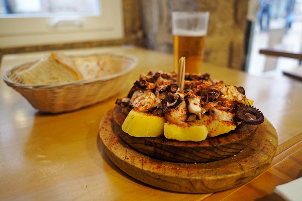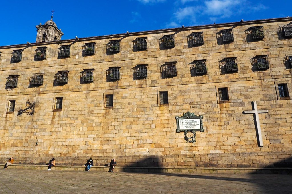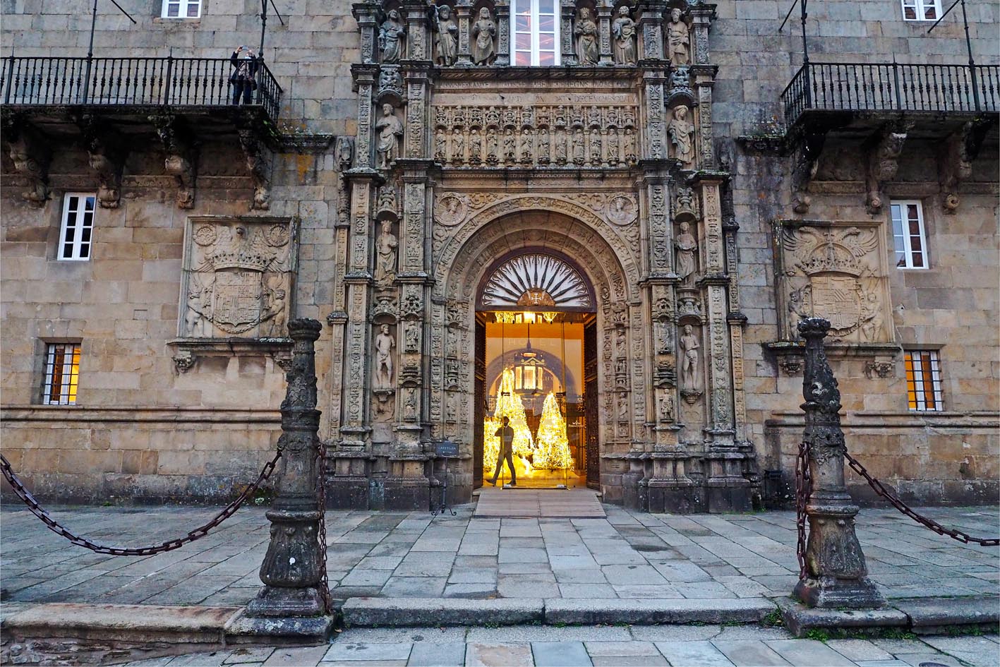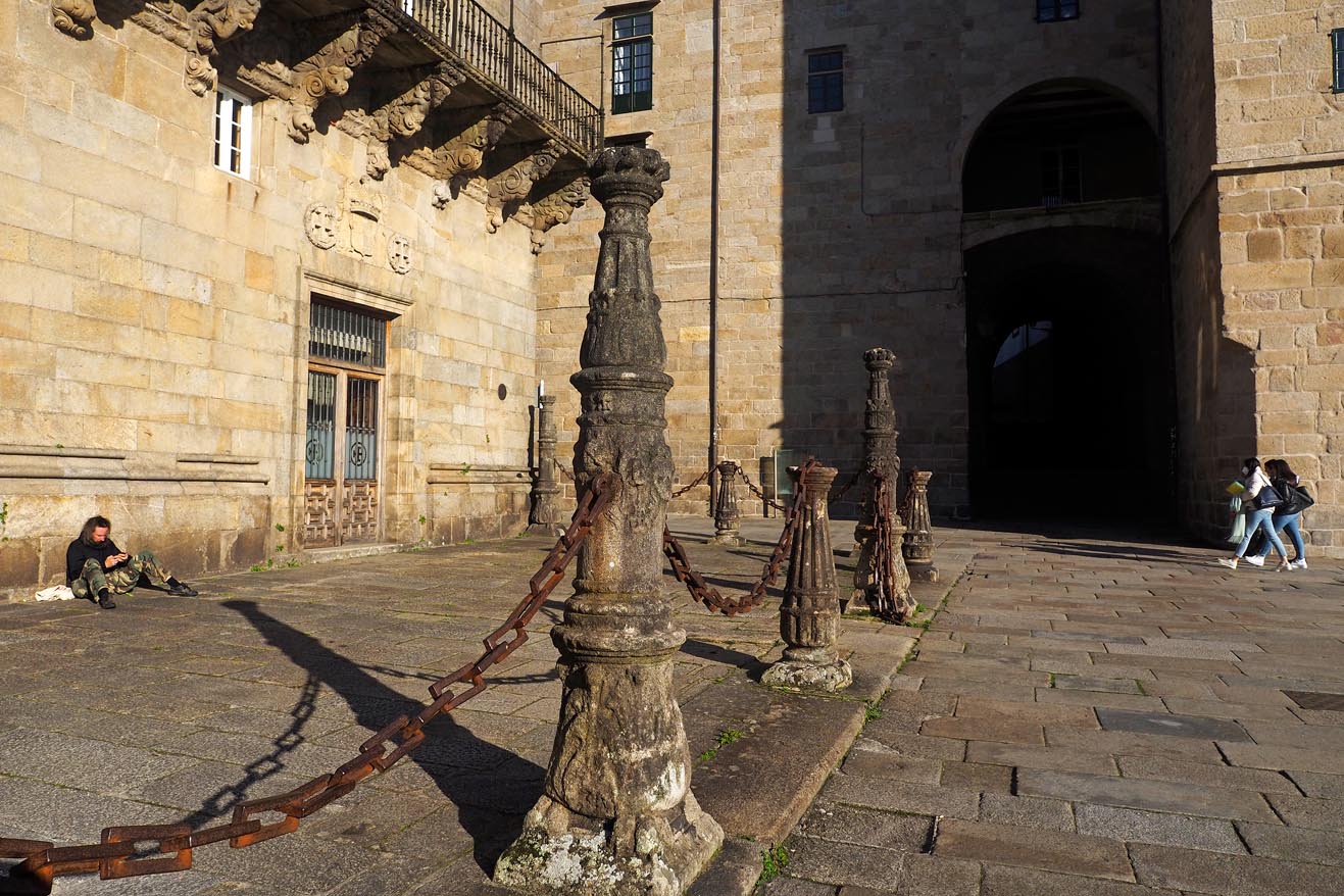Las vistas desde la Plaza del Obradoiro de la fachda de la Catedral son espectaculares. Y en fechas cercanas a Navidad, todavía adquiere un aura más mágica, con el árbol y un belén iluminado en sus alrededores. El interior, gratuito, está muy bien restaurado y puede visitarse siempre que no haya oficio. En uno de los costados se encuentra el Hostal de los Reyes Católicos, del siglo XV, construído inicialmente para albergar a peregrinos y para actuar como hospital. En su acceso principal destacan unas poderosas cadenas que, según leemos, sirvieron en el siglo XVI para delimitar el espacio físico del Hospital en sus trifulcas con el Ayuntamiento. La portada es llamativa, con relieves a derecha e izquierda de figuras como Adán y Eva, San Juan Bautista o María Magdalena. Hoy es un hotel de lujo al que se puede acceder, por lo menos a echar un vistazo, al vestíbulo principal. Por cierto, como su nombre indica, fue mandado construir por los Reyes Católicos, prácticamente coincidiendo con el descubrimiento de América.